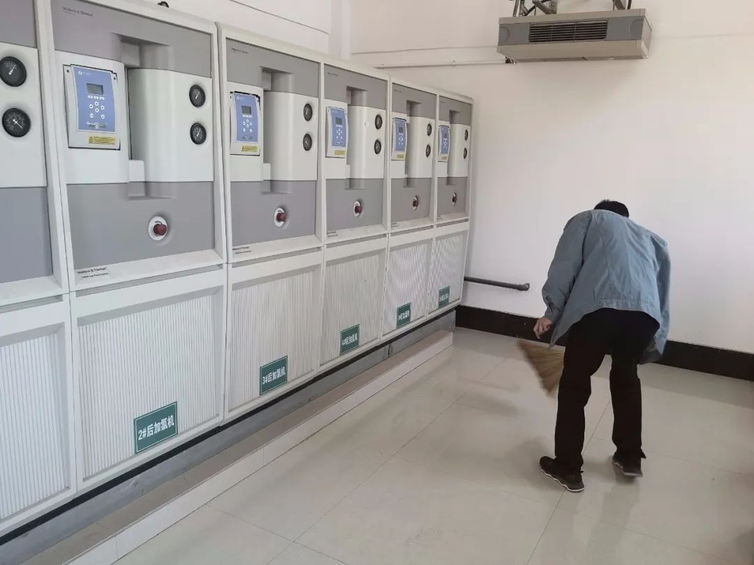 加氯设备要细心,水渍灰尘不留痕。加氯设备的清洁清理更注重谨慎细心,清洁期间全员严格遵守危险化学品管理条例操作,对加氯机部件、蒸发器部件、漏氯报警器及氯回收装置进行清洁保养,并打扫氯瓶表面、加氯管路,将设备工具和专用防护服统一摆放整齐。地面清洁则采取拖布加刮擦的方式,保证不留水渍不留痕迹。