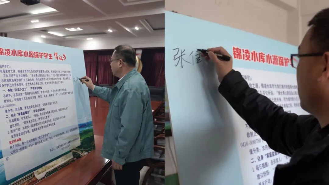 活动的高潮环节,学生代表带领全场学生共同宣读了《锦凌水库水源保护学生倡议书》。随后,40名“护水小卫士”在《承诺书》上郑重签字。他们承诺严格遵守《锦州市锦凌水库饮用水水源保护条例》,坚决不在保护区内进行污染活动,积极举报违法行为,主动履行环保责任,切实将环保理念传递到每个家庭之中。一份份满载责任与希望的承诺书,承载着他们守护水源的坚定信念。最后,全体参与者与庄严的党旗合影留念,为活动画上了圆满的句号。
