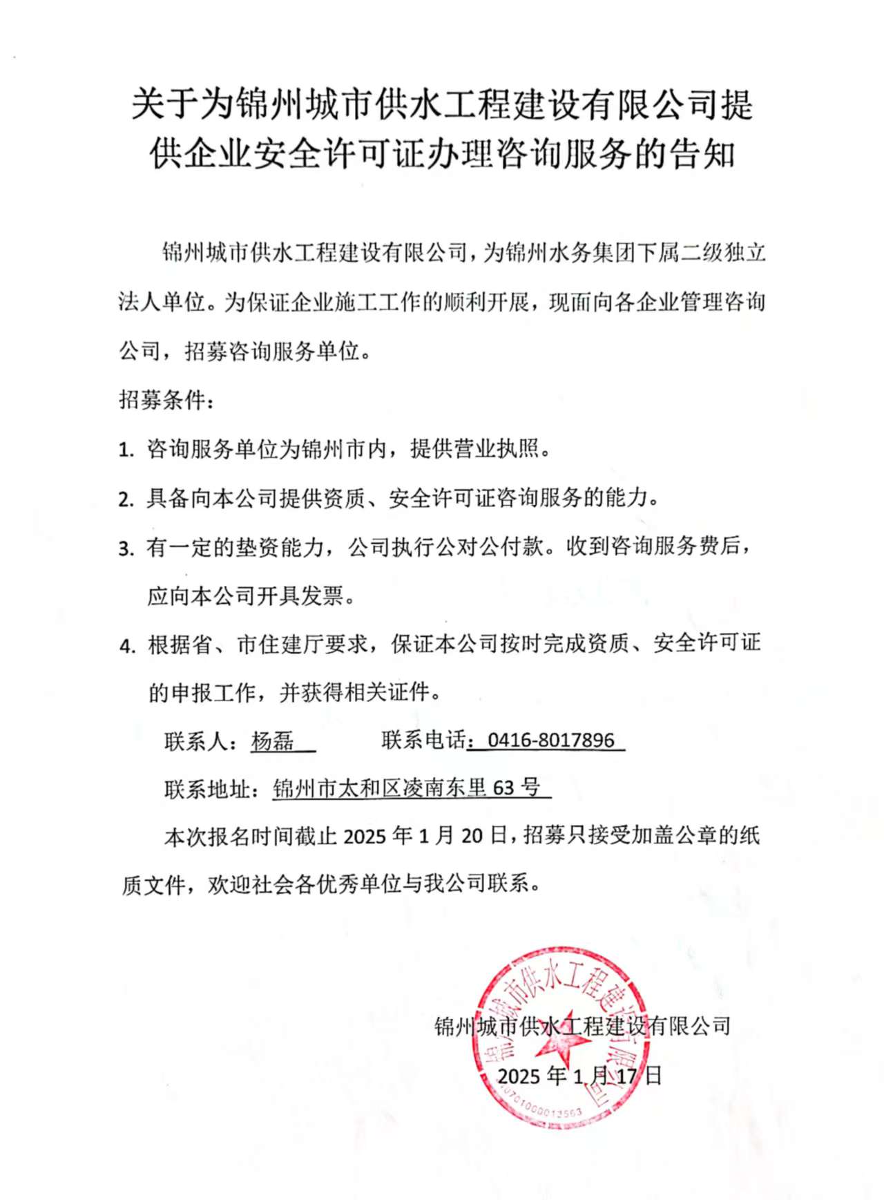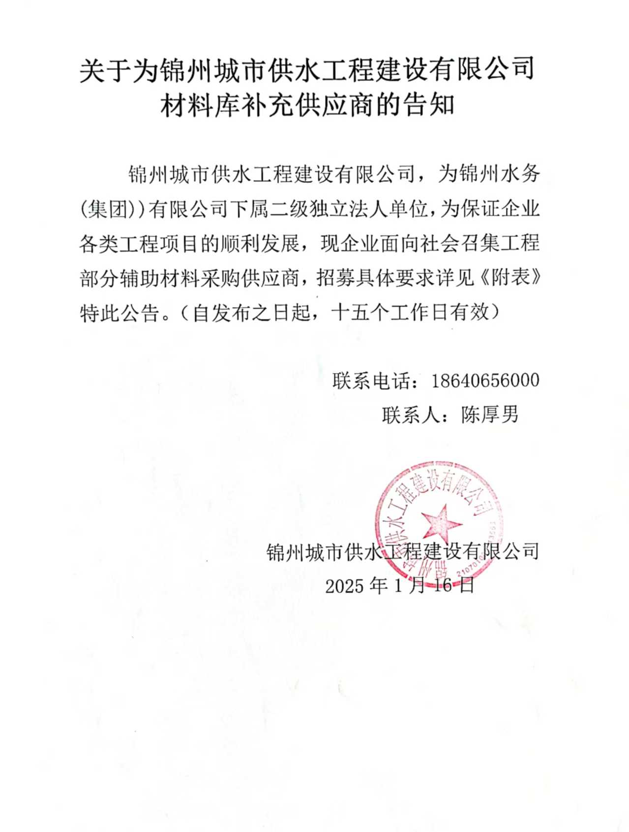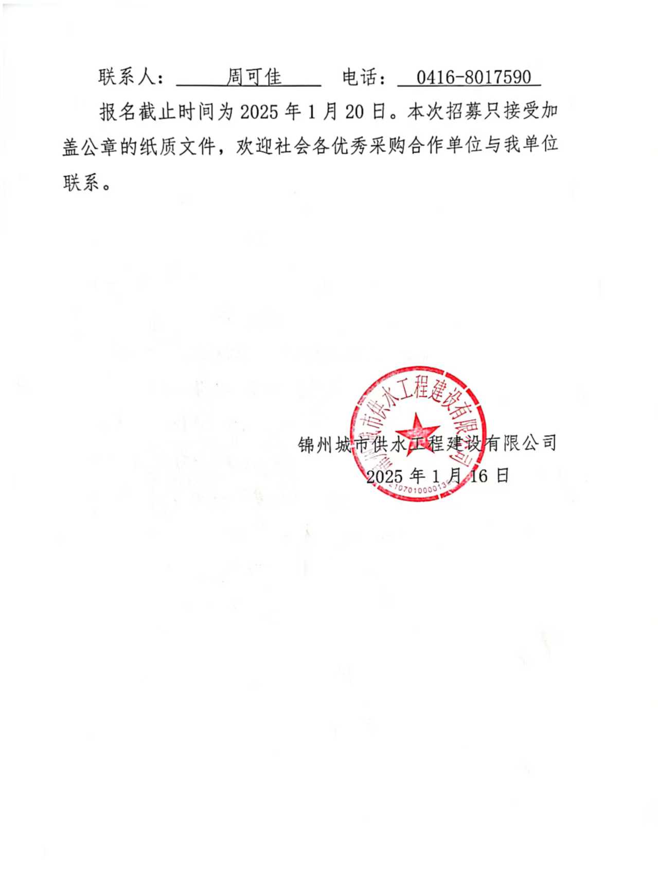 锦州城市供水工程建设有限公司2025年公开招募施工类工器具采购合作单位的公告